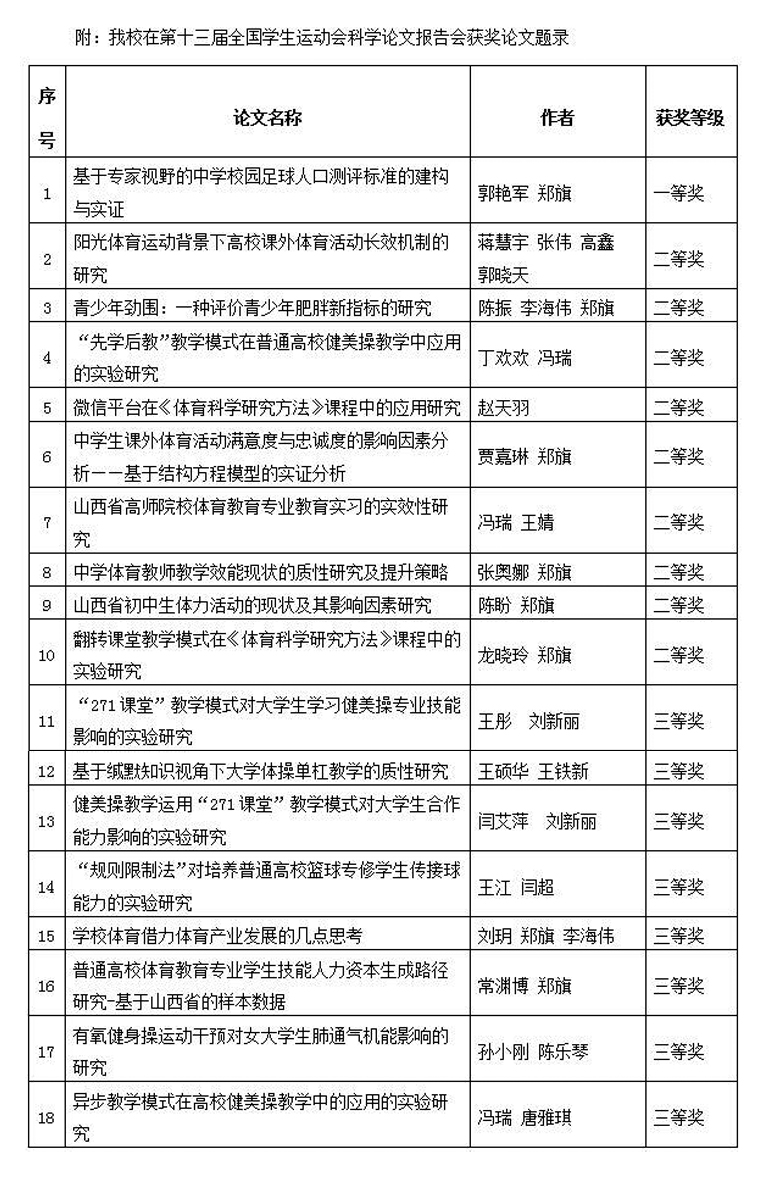 在这次大会中,公司304永利集团郭艳军、郑旗报送的《基于专家视野的中公司园足球人口测评标准的建构与实证》论文荣获一等奖;冯瑞、王婧报送的《山西省高师院校体育教育专业教育实习的实效性研究》等9篇论文荣获二等奖;王彤、刘新丽报送的《“271课堂”教学模式对老员工学习健美操专业技能影响的实验研究》等8篇论文荣获三等奖。公司304永利集团师生在本次报告会中表现亮眼,并得到省教育厅首肯,尤其是助力山西省在第十三届全国员工运动会科学论文报告会中取得历史性突破发挥了重要作用。(文/304永利集团 邓碾管 摄影)
