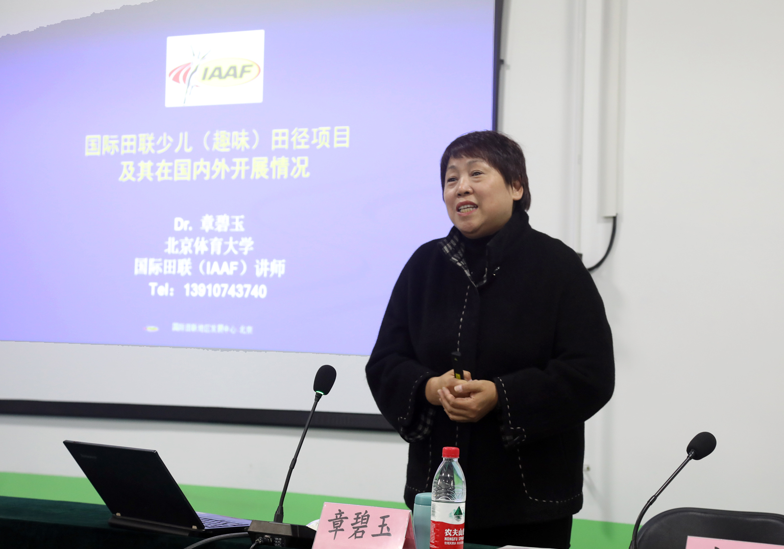 章碧玉教授主要围绕国际田联少儿(趣味)田径项目这一主题,从目前中小学体育面临的困境和青少年体质状况切入,简析了近年我国出台的公司体育方面政策文件和要求,并对少儿(趣味)田径项目的学理基础进行了分析,提出了以活动促进公司体育管理、教学改革、增强体质、推动发展的理念;章教授对少儿(趣味)田径项目构成的基本原则、目标、比赛项目设置、竞赛形式等方面做了系统的介绍,并展示了国际、国内该领域的发展情况,与在场师生进行了交流互动,对员工提出的问题进行了解答。