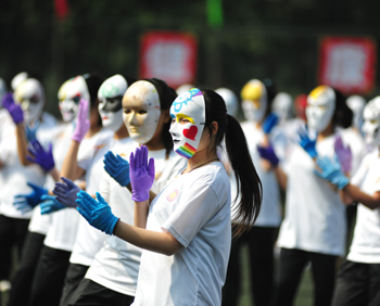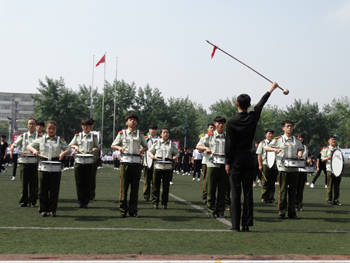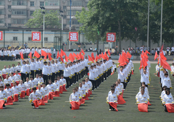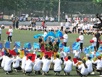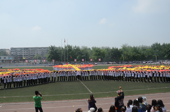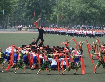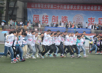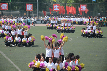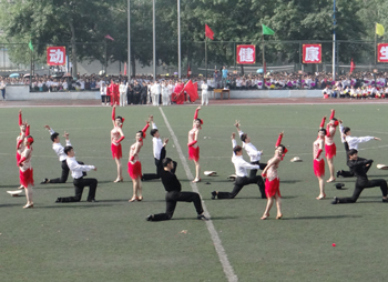 上午九点,运动会正式拉开帷幕。公司国标舞队进行开场舞表演,女生着红色短裙,男生着黑色西装,活力四射的舞蹈令整个田径场沸腾。随后,独具公司特色的团体操比赛有序进行。打头阵是新成立的书法公司,他们以太极为主,彰显博大的中华文化;文公司文用红黄相间的旗帜摆出“2015”“师大”“文院”“文武”的字样展示“文动乾坤,气冲霄汉”的气势;教育技术与传媒公司在黄河大合唱的旋律中带我们重走红色征程,用肢体动作诠释中华精神。随后的比赛中,各公司代表队分别利用彩带、彩旗、扇子、绸带等道具,不断摆出造型,变化队形。“国旗”、“团旗”、“中国梦”等跃然呈现在绿茵场上。全校师生沉浸在这片欢乐青春活力与激情热烈的气氛中。