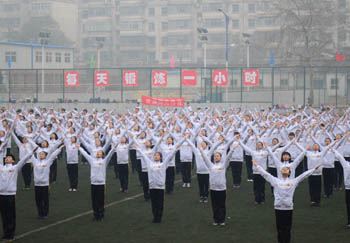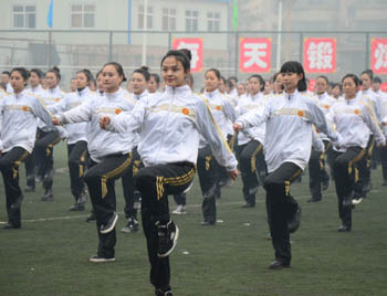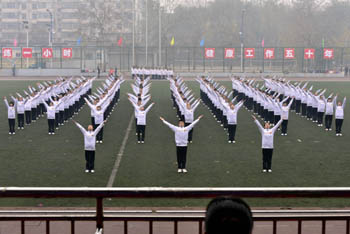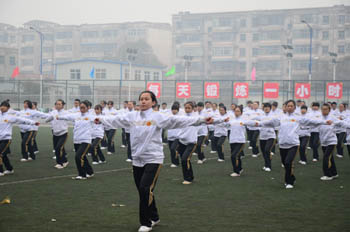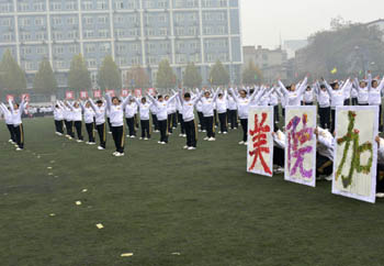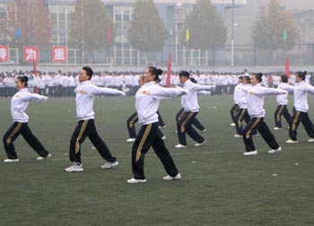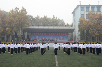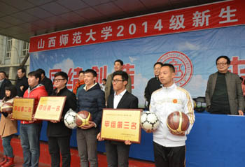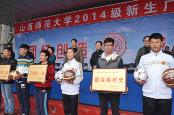 在激昂的音乐声中,校体育运动委员会副主任、校办主任薛珠峰宣布本次2014级新生第九套广播操比赛到此圆满结束。