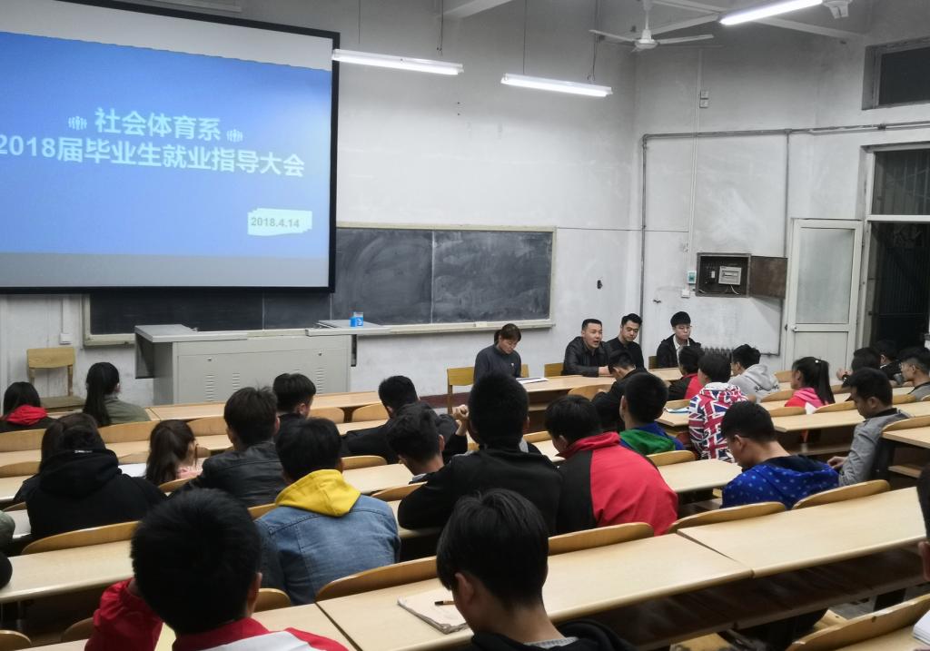 4月14日晚上七点半,社会体育系在阶三教室举办了2018届毕业生就业指导大会。系副主任兼1401班辅导员杜治华、1402班辅导员杨泽丽老师、北京能动时代体育有限公司张泽伟及所有毕业生参加了本次会议。
