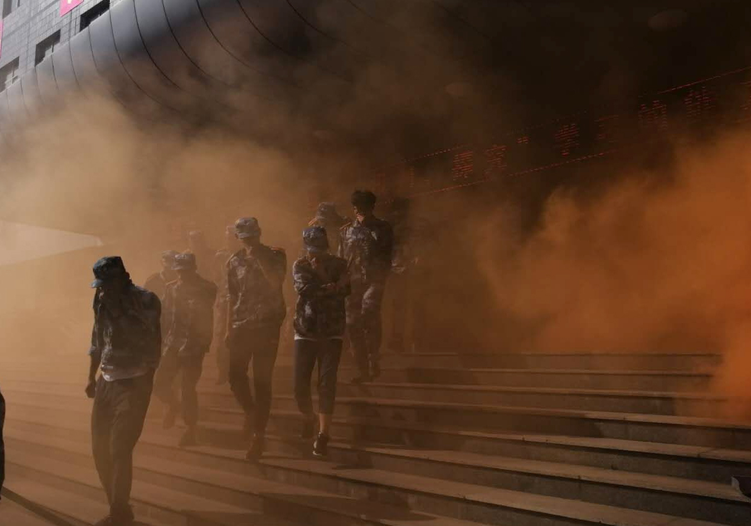 接着,全体新生在教学楼内进行消防应急疏散演练,伴随着一声紧急的哨声,同学们俯身弯腰,捂住口鼻,有序逃离危险地带。
