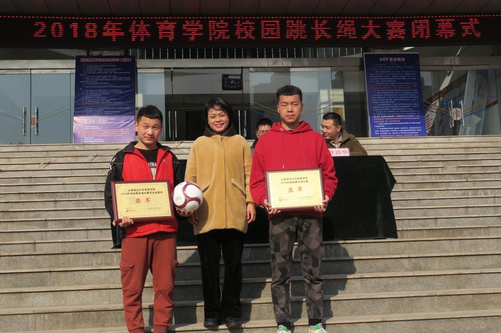 2018年校园跳长绳大赛自12月4日开赛,各参赛班级代表队以饱满的热情积极参加,绳子被同学们抡得呼呼生风,打得地面叭叭直响,同学们穿梭其间,动作敏捷;各队伍队员之间相互鼓励,协调配合,全身心地投入比赛,跳出了各自最好的成绩,激发了运动员的无限潜能。39支队伍460余名运动员经过一周激烈的角逐,最终体教1803班、文理1803班、社体1601班分别荣获团体冠军、亚军、季军;社体1801班、文理1703班、社团联合会、体育教育系员工会荣获优秀组织奖;文理1601班、体教1605班运训员工会、民体员工会获得道德风尚奖。董冬冬、魏朋通、张丹丹等同学获得优秀运动员称号,王漫、王佳琪、高雅政等获得优秀裁判员称号。大赛裁判长杜治华老师宣读了比赛成绩和获奖名单,随后出席闭幕式的老师为获奖的集体和个人颁奖并合影留念。