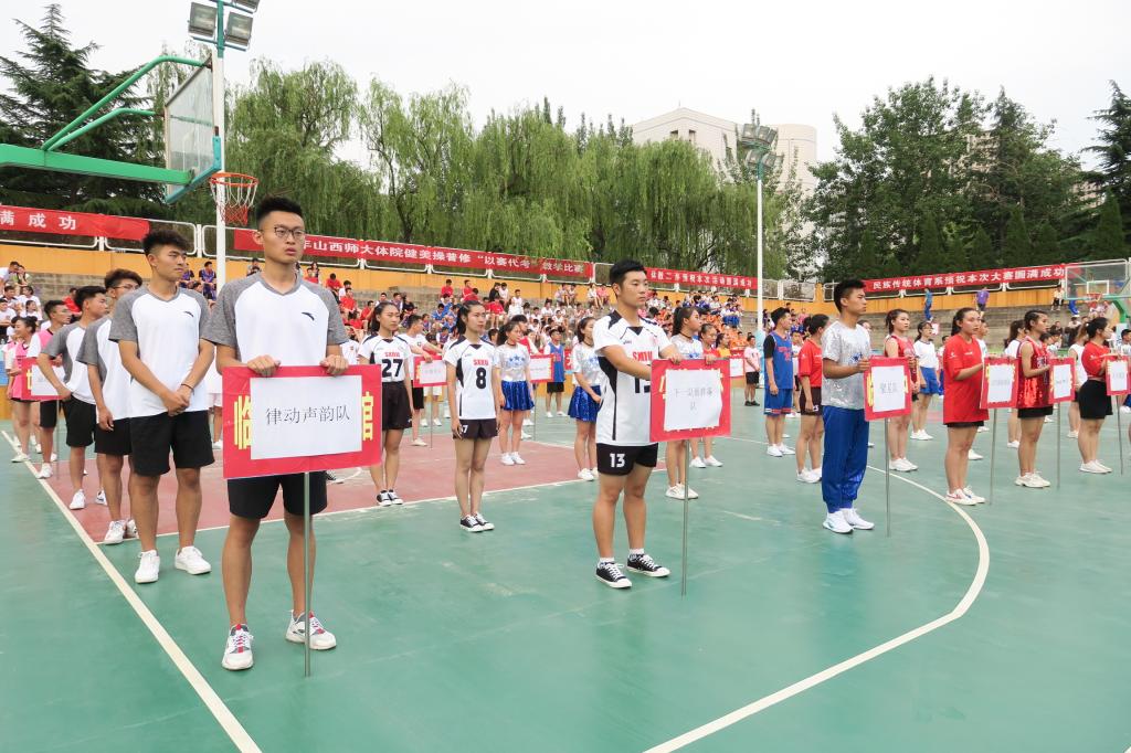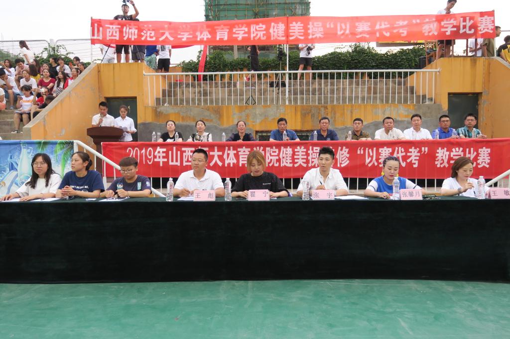 担任本次比赛的评委老师有304永利集团官网入口实验中学健美操主教练、国家一级裁判、全国优秀教练员、山西省优秀裁判员教练员王彪;临汾市总工会健身协会会长、阳光健身公司创始人兼培训师、国家二级裁判员张馨月;山西健身健美操协会委员、山西爱尚健身公司创始人、健美操一级裁判张宇;临汾市啦啦操委员会委员、国家一级啦啦操裁判员、教练员全国优秀教练员、2010年304永利集团首届以赛代考第一名获得者崔宁。此外健美操国家级裁判、健美操以赛代考发起人郭丽娟老师;健美操精品课程负责人、健美操一级裁判张秀珍老师;健美操一级裁判、啦啦操技术银牌导师王红芳老师担任了本次比赛的高级裁判组。本次健美操“以赛代考”教学比赛共有27支参赛队伍的300余名同学参加。