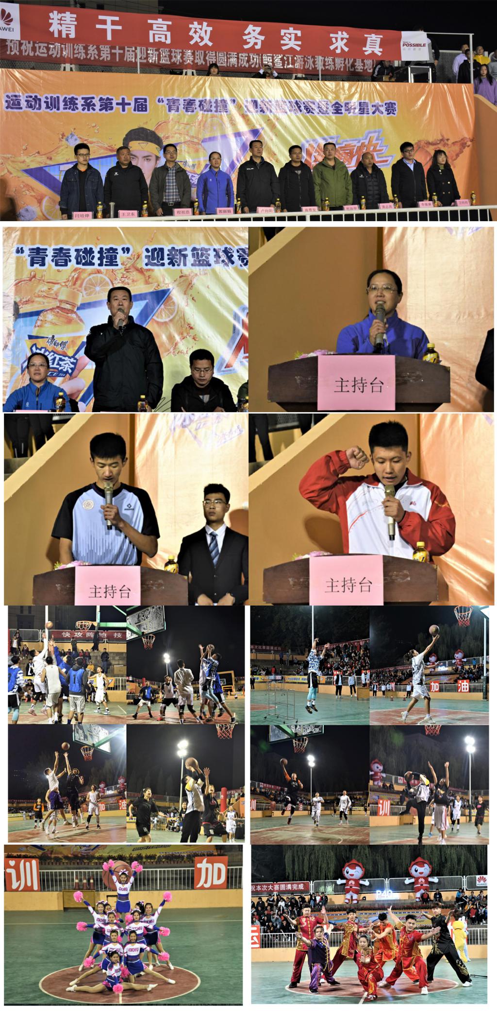 10月23日晚,由运动训练系主办的第十届“青春碰撞”迎新篮球赛在公司灯光篮球场举行。副经理卢向阳、院办主任高贯发、院团委副书记程祖浩、运动训练系主任郭丽娟、副主任杜治华及系全体辅导员参加了开幕式,并全程观看了迎新篮球赛。
