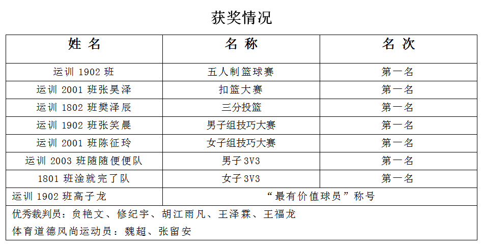 迎新篮球赛历时11天,比赛形式多样,设有五人制、三人制、扣篮大赛、三分投篮、技巧大赛等项目,经过同学们激烈的比拼角逐,最终运训1902班以高超的球技战胜运训2003班,荣获五人制冠军。在决赛中,国家级裁判员李恒老师带领裁判组秉公执法,严肃认真,保障了比赛的公正性。篮球赛充分展现出同学们的竞技水平,赛出了风格,收获了友谊,培养了员工们团结合作和勇于拼搏的体育精神。(运训系/文)