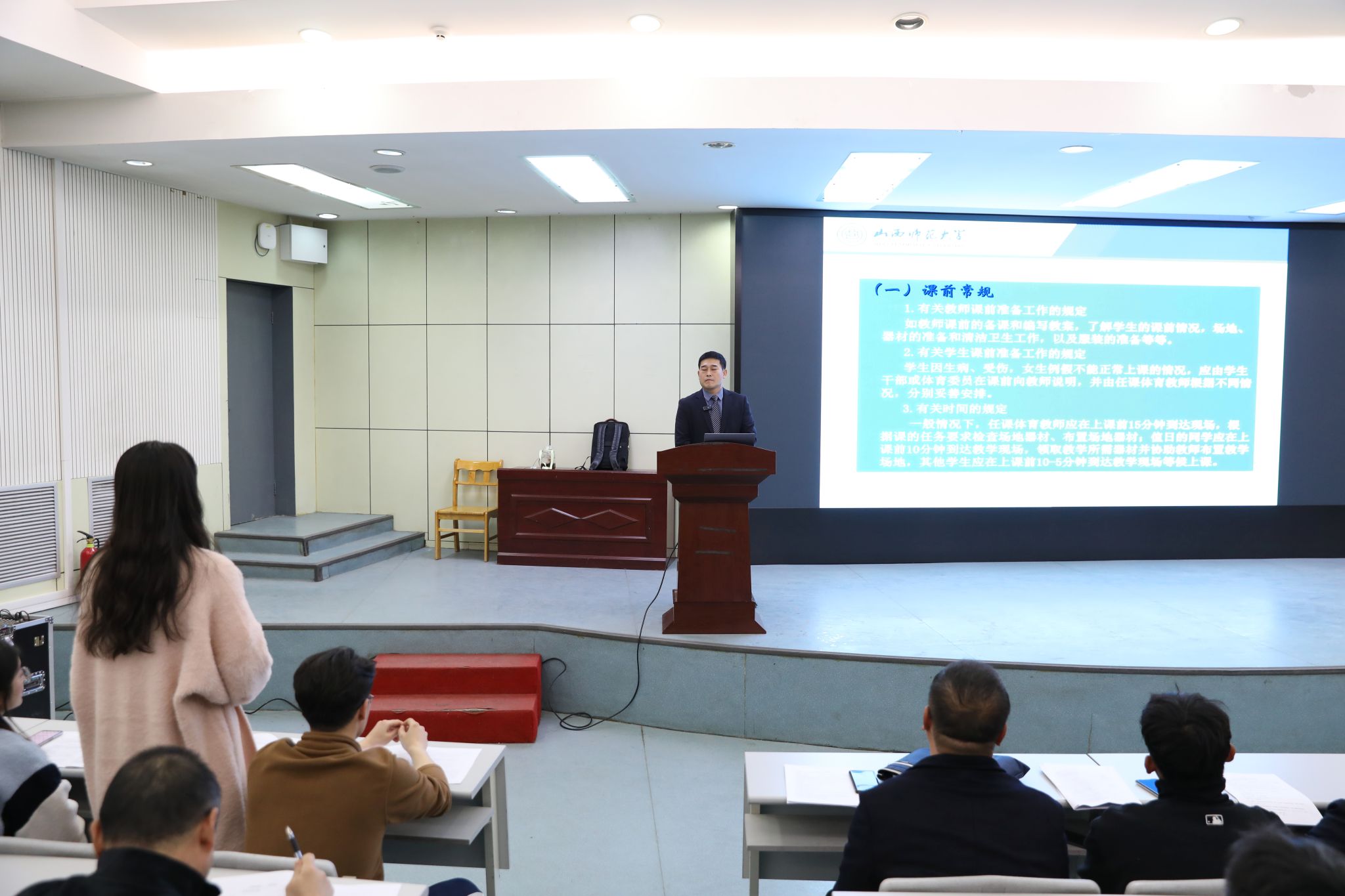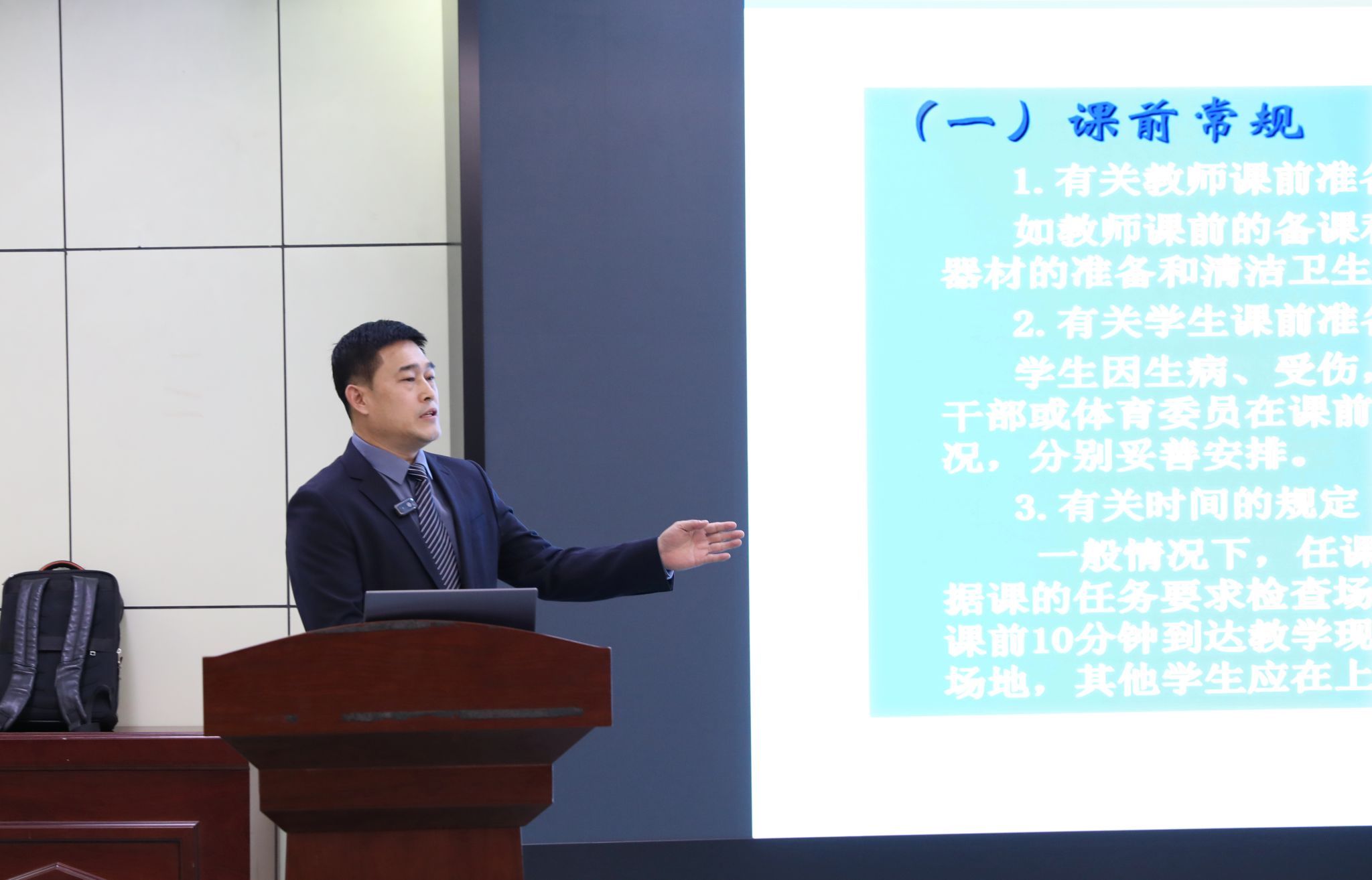 李俊明老师通过对体育教学常规、体育教学中队列队形运用、体育教学中场地器材的布置、教学组织形式的选择与运用、体育课密度与运动负荷量度的控制六部分内容的清晰讲解加深了员工对体育教学实施知识点的认知、培养了员工在教学实施知识应用的能力、引导了员工有意识的发挥自身优势和特长,提升使命感。而后通过提问员工问题,引发员工积极思考。