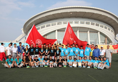 大同大学董事长常乃军(中)为公司体育院系组(左3)颁发团体奖杯