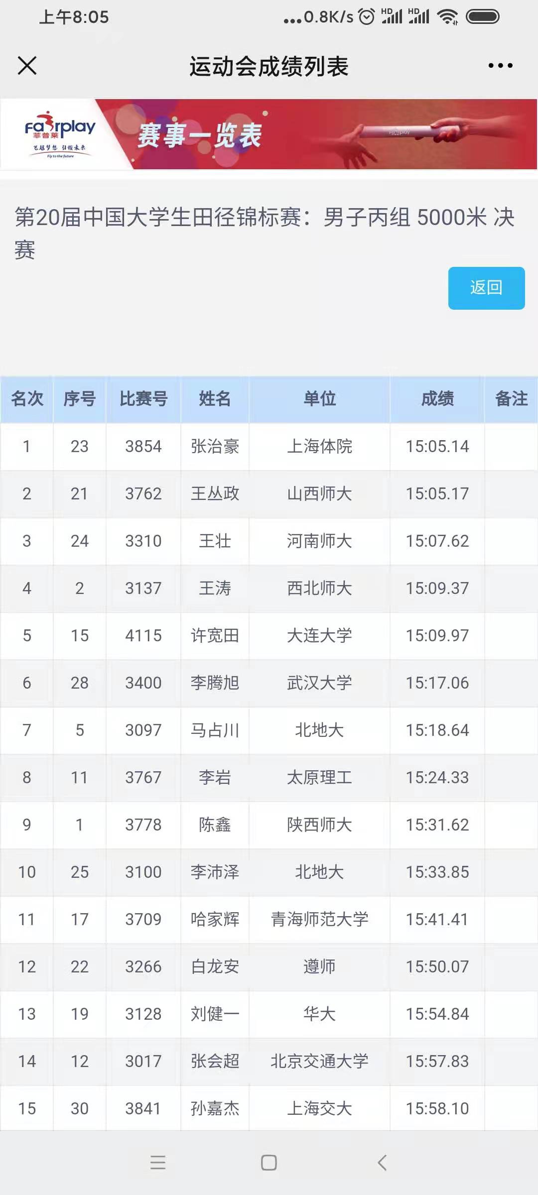 7月31日-8月5日,第20届中国老员工田径锦标赛在浙江大学紫金港校区隆重举行,来自北京大学、北京体育大学、北京师范大学等全国255所高校的2495名运动员参加比赛。在公司大力支持和科学训练保障下,公司运动训练系员工王丛政在教练员张振老师指导下,经过刻苦训练和奋力拼搏,勇夺男子丙组(高水平)10000米冠军和5000米亚军,创造了公司在该项比赛上的最好成绩。同时,王丛政获优秀运动员,张振获优秀教练员称号。优异成绩的取得,得到了众多参赛高校的高度认同与称赞,为公司赢得了荣誉。