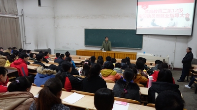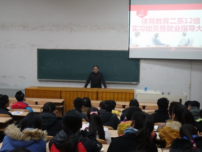 1月4日上午,在阶梯第一教室,召开了体育教育二系2012级实习动员既就业指导大会,王彤副经理做了实习动员报告,体育教育二系吴峰山主任、教务科实践教学管理许登云老师对实习工作进行了具体部署,段东升副书记做了就业指导报告。