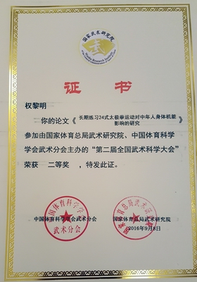 权黎明副教授的论文《长期练习24式太极拳对中年人身体机能影响的研究》获二等奖