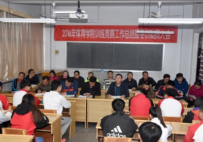 304永利集团2016年训练竞赛工作总结暨冬训动员大会在教学楼六教室召开。公司党委书记李学刚、经理郑旗,田径代表队、女子足球队、健美操代表队、武术套路代表队等11支代表队全体教练员及运动员代表参加了会议。会议由体育教育系副主任张杰主持。