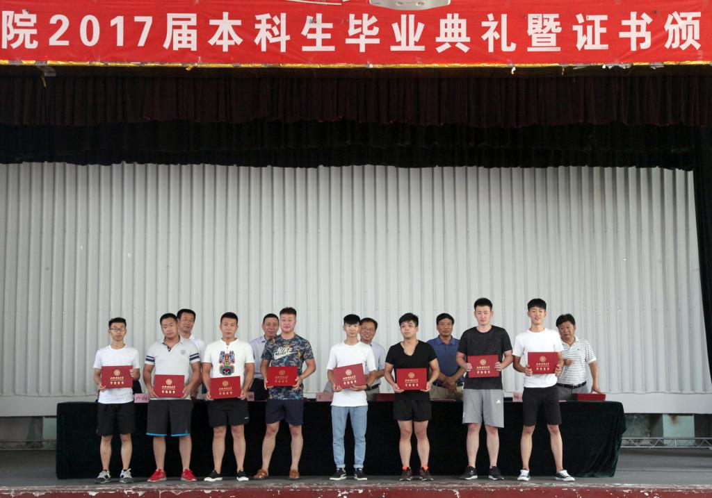 毕业生证书颁发仪式在激昂的国歌中拉开了序幕。副经理卢向阳宣布毕业资格审查结果。副经理杨永茂宣读2017届优秀毕业生名单,伴随着欢快的颁奖曲,校、院领导为优秀毕业生颁发了荣誉证书;400余名毕业生上台接受校、院领导为他们颁发的毕业证书。