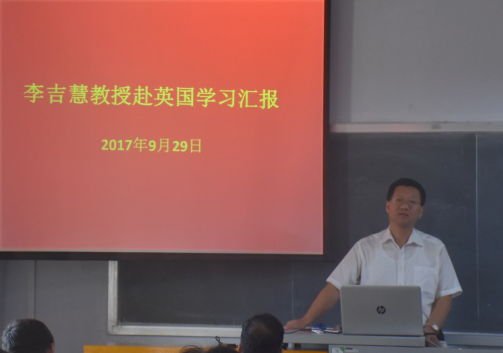 9月29日下午,在教学楼6教室,由参加国家留学基金管理委员会、全国青少年校园足球工作领导小组办公室、中国大(中)员工体育协会主办的中英高级别人文交流项目—2017年中国校园足球教师(教练员)出国留学项目的李吉慧教授做了《初识英国足球》的报告,他从英国社区体育及大众足球活动;英国青少年足球培养体系透析;英国足球青训教练员队伍;英国足球管理者及从业者及印象;英国足球俱乐部等五个方面谈了在英国曼彻斯特大学三个月培训的学习成果与感想体会。