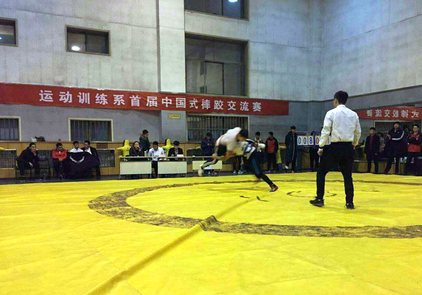 为响应党的十九大广泛开展全民健身活动的号召,丰富校园文化生活,促进员工全面发展,提升专业技能,运动训练系于12月1日、2日在综合馆一层成功举办了首届中国式摔跤交流赛。本次比赛设男子跤65kg级、65kg~75kg级、75kg级和女子48kg级四个项目,采用单败淘汰复活制。在比赛中,选手们矫健灵活,斗志昂扬。别、挑、跪、靠,一招一式,环环相扣,以力量制敌,以技巧取胜,雷霆万钧中见大气磅礴。此次比赛的报名人数达到了50人,经过赛场的激烈角逐,最终12名同学脱颖而出,张伯超等4名同学摘得了桂冠。