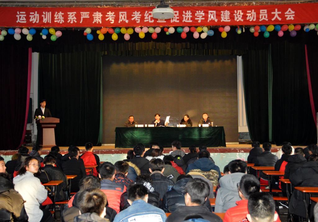 为了进一步加强运动训练系学风建设,端正同学们的考试态度,构建诚信校园,保证期末考试顺利进行。运动训练系于12月27日在304永利集团礼堂召开了“严肃考风考纪暨促进学风建设动员大会”,倡导同学们“端正考风、严肃考纪、规范答题、诚信应考”。参加本次会议的领导老师有:运动训练系主任张伟老师、辅导员王文武老师、高琴老师和贾建学老师。