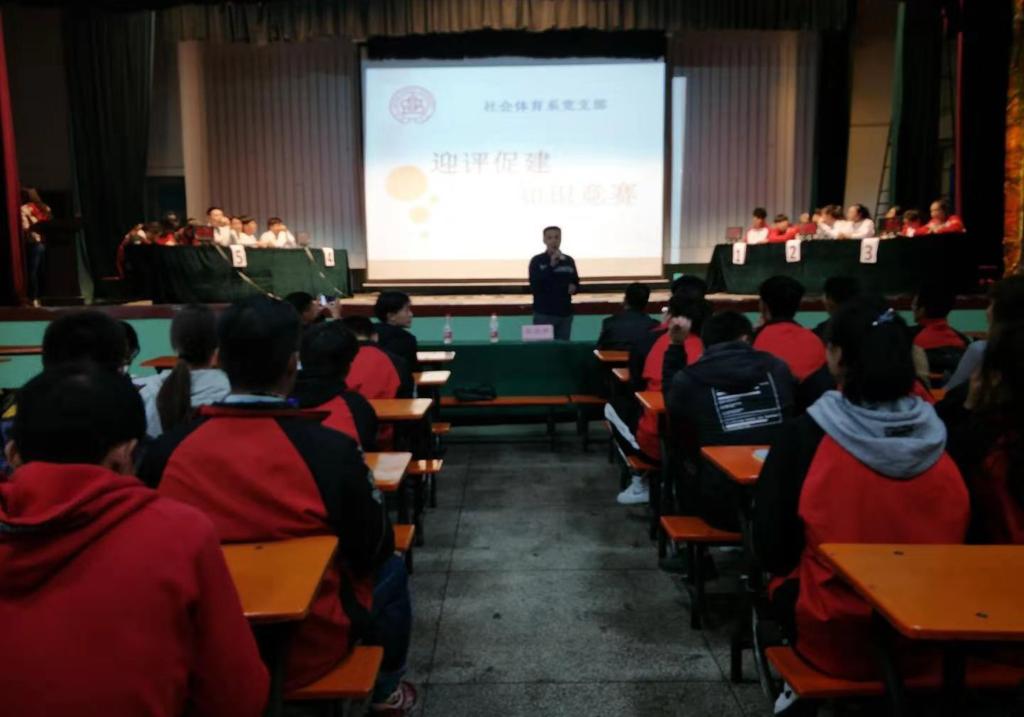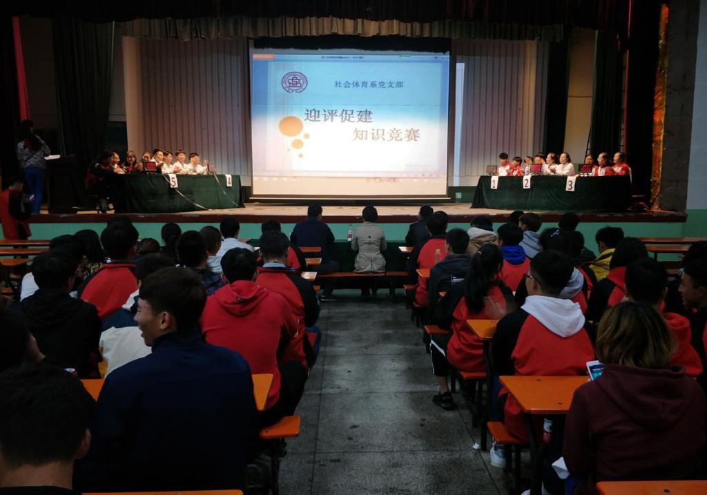 为了配合公司做好本科教学审核评估工作,使员工更加深入地了解评估的相关内容,传播积极的迎评思想和营造良好的学习氛围,社会体育系党支部于10月25日晚上七点在大礼堂举办了“迎评促建知识竞赛”。社会体育系党支部书记陈乐琴、支部委员杜治华、辅导员邓碾管参加了本次活动,各班团支部分别组织男、女两支队伍参加竞赛,社会体育系全体员工观看比赛。本次知识竞赛分为三个环节,即必答题、博弈题、风险题,经过三轮精彩比拼,最终社体1601班参赛选手赢得冠军,1701班获得亚军,1801班获得季军。比赛结束后杜治华老师对本次活动做了总结讲话,他说:“这是一场特殊而有意义的比赛,没有输赢之分,更重要地是为我们在场的每一个人搭建一个巩固迎评知识的学习平台。我们每一个人都要有主人翁的意识,以更加饱满的精神风貌投入迎评工作,并借迎评东风推动社体系的发展!”