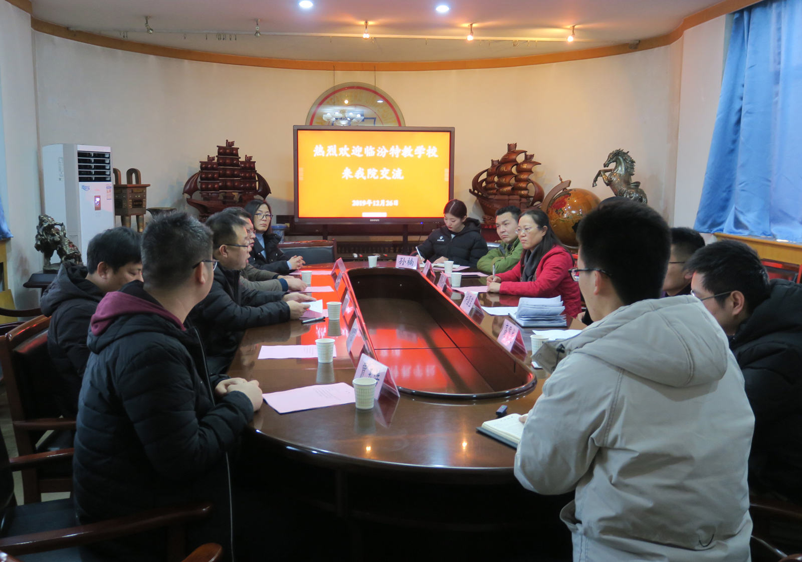 12月26日下午,临汾特教公司董事长吴笃贤一行五人来公司交流工作,公司党委书记许国宝、运动训练系主任郭丽娟、办公室主任高贯发、团委副书记程祖浩、运动训练系副主任杜治华以及员工代表参加了交流座谈。