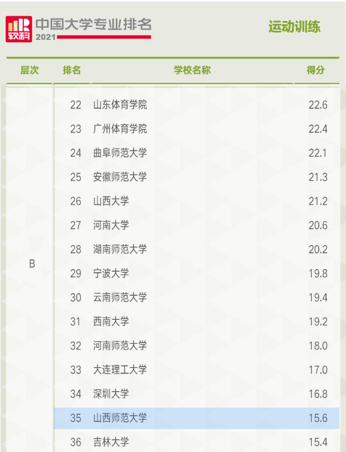 6月22日,高等教育评价专业机构软科正式发布2021“软科中国大学专业排名”,每个专业发布位列前50%的高校,共有925所高校的28550个专业上榜。公司体育教育、社会体育指导与管理、武术与民族传统体育、运动训练等4个专业上榜。公司4个本科体育专业上榜,对于公司从公司条件、学科支撑、专业生源、专业就业、专业条件等方面诊断专业建设及其发展定位提供了参考依据。