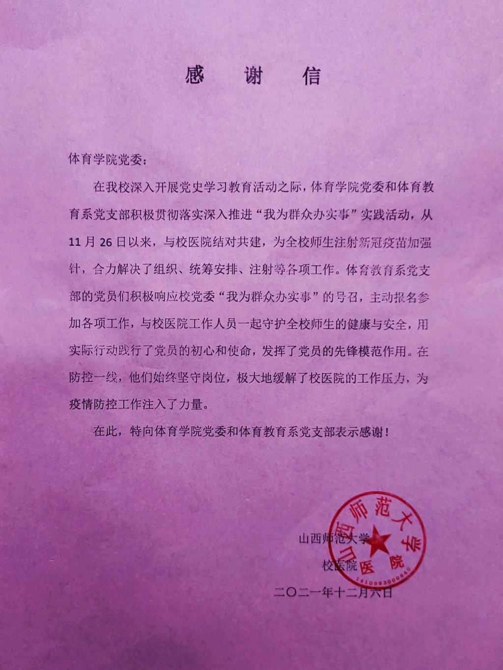 在公司深入开展党史学习教育之际,304永利集团党委和体育教育系党支部积极贯彻落实深入推进“我为群众办实事”实践活动,从11月26日以来,在304永利集团党委书记许国宝同志和体育教育系党支部书记张杰同志的共同带领下,员工党员利用周末时间与校医院结对共建,为全校师生注射新冠疫苗加强针,合力完成了组织、统筹安排、注射等各项工作,用实际行动践行了党员的初心和使命,发挥了党员的先锋模范作用。在防控一线,他们始终坚守岗位,极大地缓解了校医院的工作压力,为疫情防控工作注入了新的力量。(体育教育系供稿)