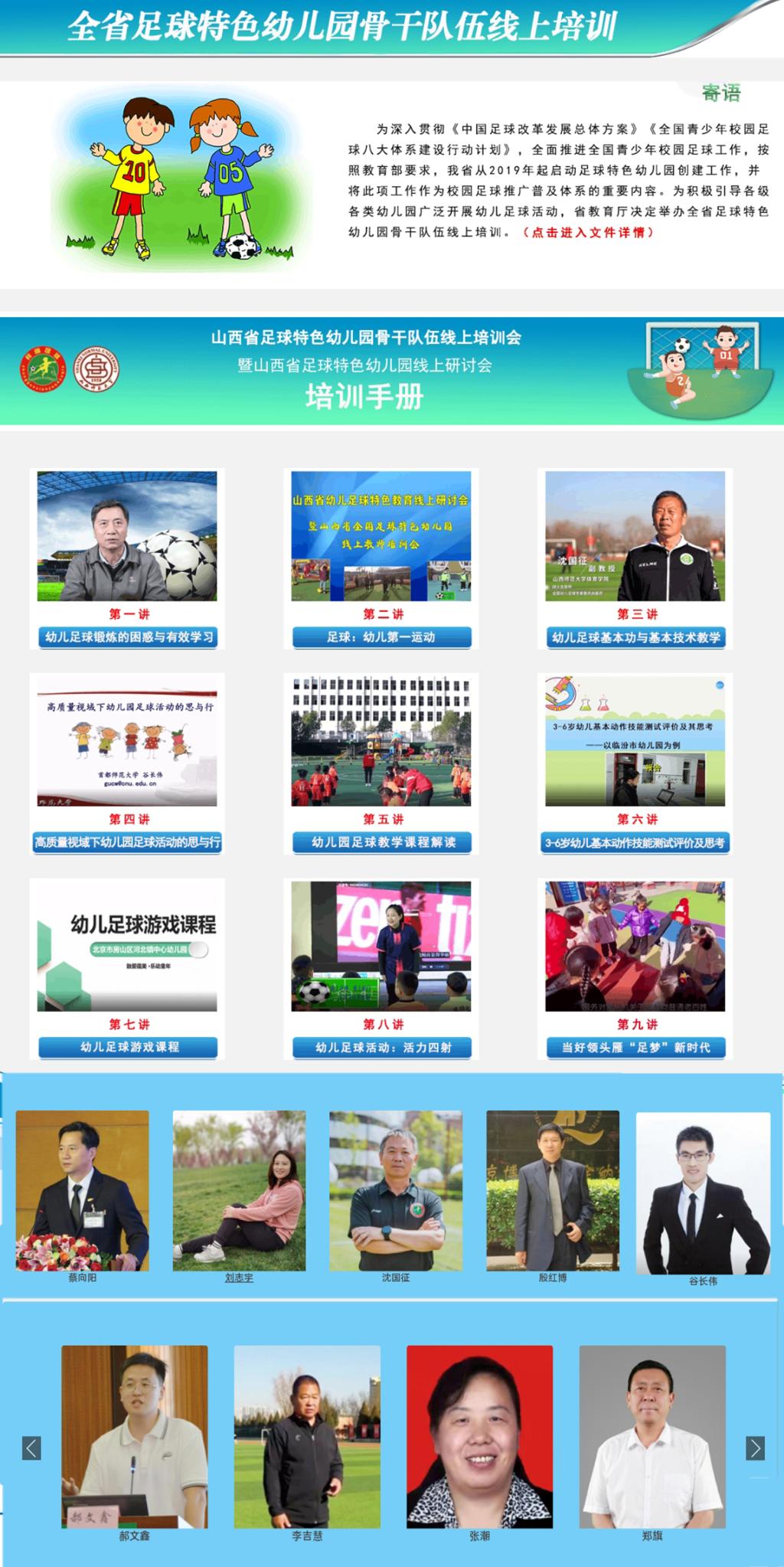 1月19日,山西省教育厅发布《关于举办全省足球特色幼儿园骨干队伍线上培训的通知》,标志着全省足球特色幼儿园骨干队伍线上培训暨足球特色幼儿园线上研讨会正式开班。本次培训与研讨会由公司304永利集团、教育科学公司、山西省幼儿教育发展研究院共同承办,培训时间为2022年1月19日至3月31日,培训对象为全省足球特色幼儿园园长、教师、足球教练员。
