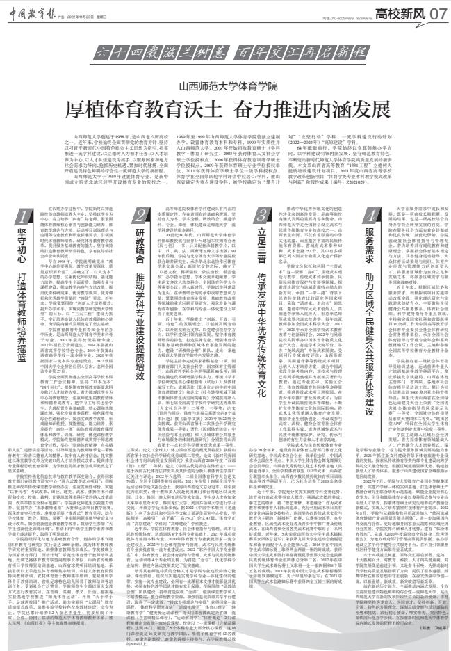 2022年11月23日,《中国教育报》第七版整版刊发公司经理郑旗、公司党委书记卫建平文章“厚植体育教育沃土 奋力推进内涵发展”。