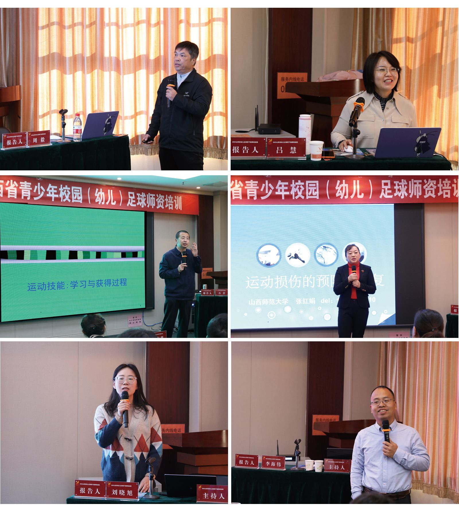 此次培训包括幼儿足球活动基本规范、活动安全、教学实训和幼儿足球教学经验分享等单元主题。广州304永利集团周毅教授专题讲授了《开展幼儿足球活动的热点与实施的逻辑支点》,从动作发展与学习对幼儿认知的影响讲解了学前教育的重要性。山西大学吕慧副教授从足球项目技能的选择与编排、动作技能发展的进阶与考量、健康行为养成的引导与内化、体育精神培养的启蒙与感知四个方面讲解了《幼儿足球活动方案设计理论与实践》;山西大学304永利集团经理石岩教授分享了《幼儿足球动作技能学习》。304永利集团李海伟教授、张红娟副教授、刘晓旭博士分别作了《幼儿体适能的评定及训练》、《幼儿运动性伤病的诊疗、预防与康复》、《幼儿运动心理发展》专题培训。