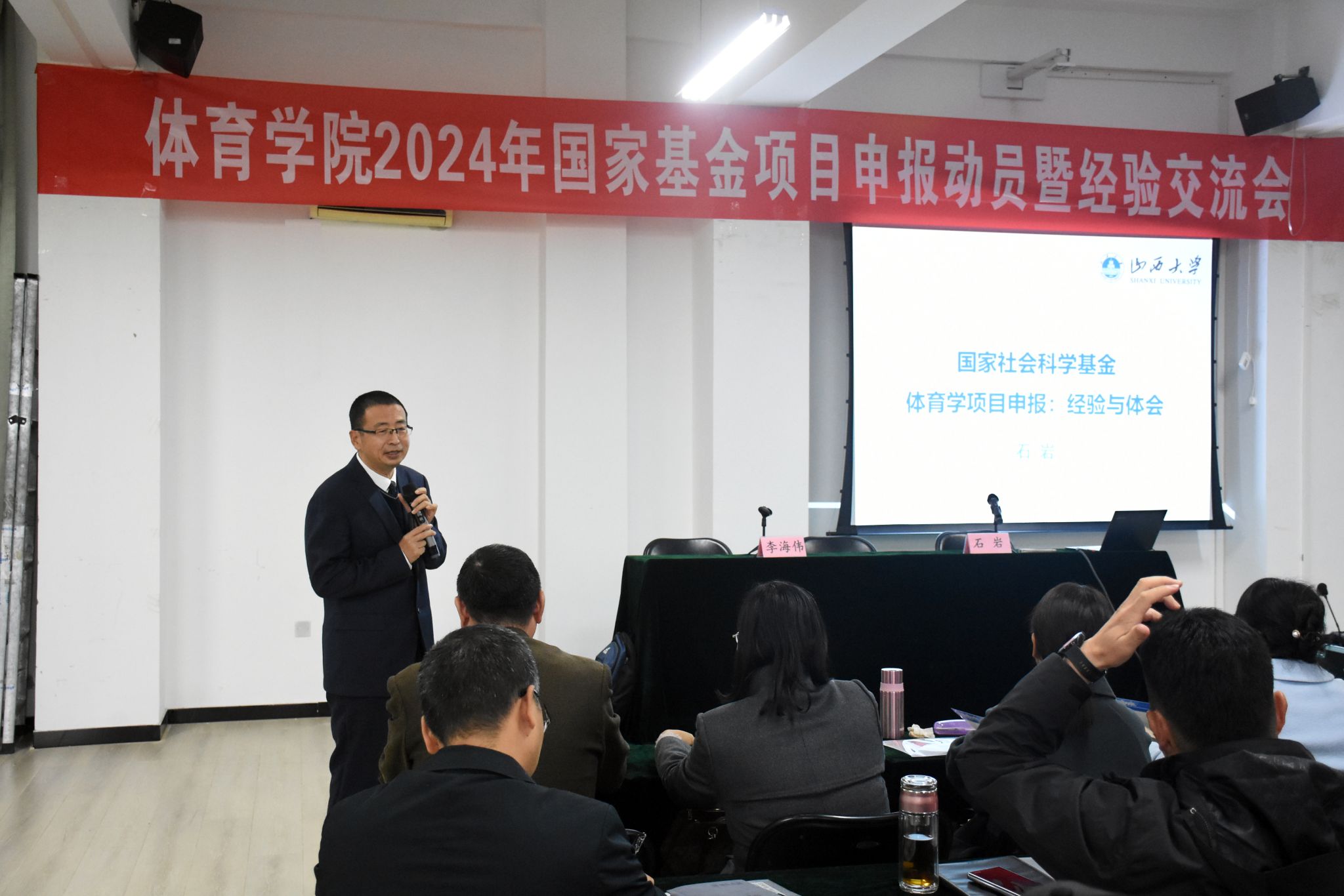 11月15日下午,304永利集团2024年国家基金项目申报动员暨经验交流会在体育心理实验室召开,会议邀请山西大学304永利集团经理石岩教授进行了申报经验交流。