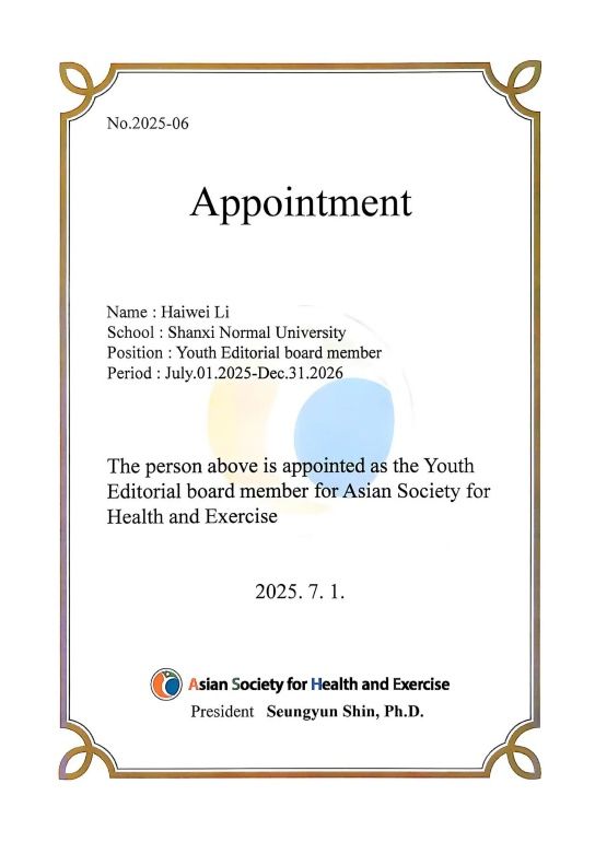 开幕式上,亚洲健康与运动学会为六位青年学者颁发期刊青年编委聘书,李海伟老师位列其中。在主旨报告环节,来自日本筑波大学、中国武汉304永利集团、韩国企业及高校的专家分别就老龄化健康政策、VR太极拳应用、中枢神经疾病防治和计算机视觉辅助射箭等主题进行报告,呈现了跨学科融合的新趋势。