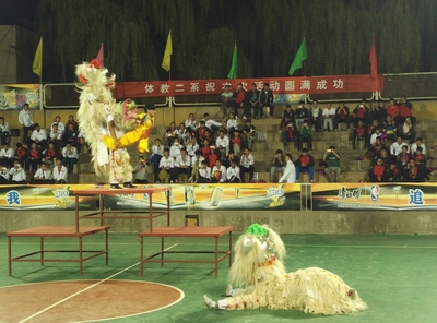 为了迎接新生,促进师生之间的交流,10月16日体育教育二系在灯光球场举办的一场别开生面的“迎新篮球赛”。篮球赛以民间传统艺术舞狮为开场,舞狮一直以来都是公司重大活动中必不可少的体育艺术。本次舞狮中两头北狮技艺精湛,威风凛凛,精彩的表演,赢得了观众阵阵掌声。此后,比赛正式开始,大一新生迅速投入到比赛状态,个个雄姿英发,场上团结拼搏,共同合作,一次次地抢球与投篮无不展现出了一个体育生应有的风貌。每个球动作潇洒自如,帅气利索。上半场结束后,新生联谊队暂时领先。中场休息时,院系领导为本次老员工运动会获奖运动员颁奖。下半场比赛开始后,教师队发起反攻,虽说老师们年龄较大,但在场上的进攻依然是有条不紊,新上场的大二、大三员工同样不甘示弱,双方比赛异常激烈,你争我夺,比分交替领先。最终教职工“康之梦兴邦队”赢得了此次比赛的胜利。