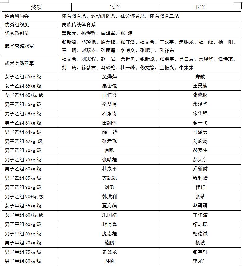为进一步推动武术运动的普及与开展,弘扬传统文化,丰富校园体育文化生活,12月5日—12月10日,由304永利集团团委员工会主办,民族传统体育系团总支、员工会、社团联合会共同承办的2020年304永利集团第四届武术大赛(第十七届“搏击杯”武术比赛暨“以赛代考”散打擂台赛)于12月5日—10日在综合馆一层顺利举行,本次武术大赛分为套路与散打两个项目。其中武术大赛搏击杯设有甲乙两个组别(其中男子甲组有60kg、65kg、70kg、75kg、80+kg;女子甲组有55kg、60+kg;男子乙组有55kg、58kg、61kg、64kg、67kg、70kg、75kg、80kg、85kg、90kg、90+kg;女子乙组有55kg、65kg、65+kg)。