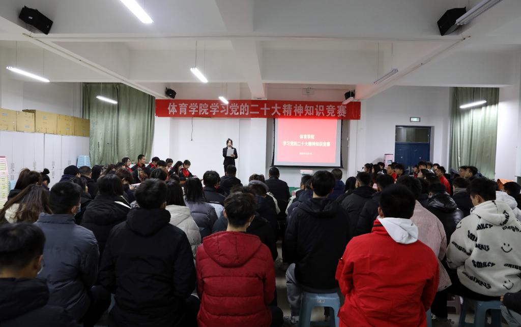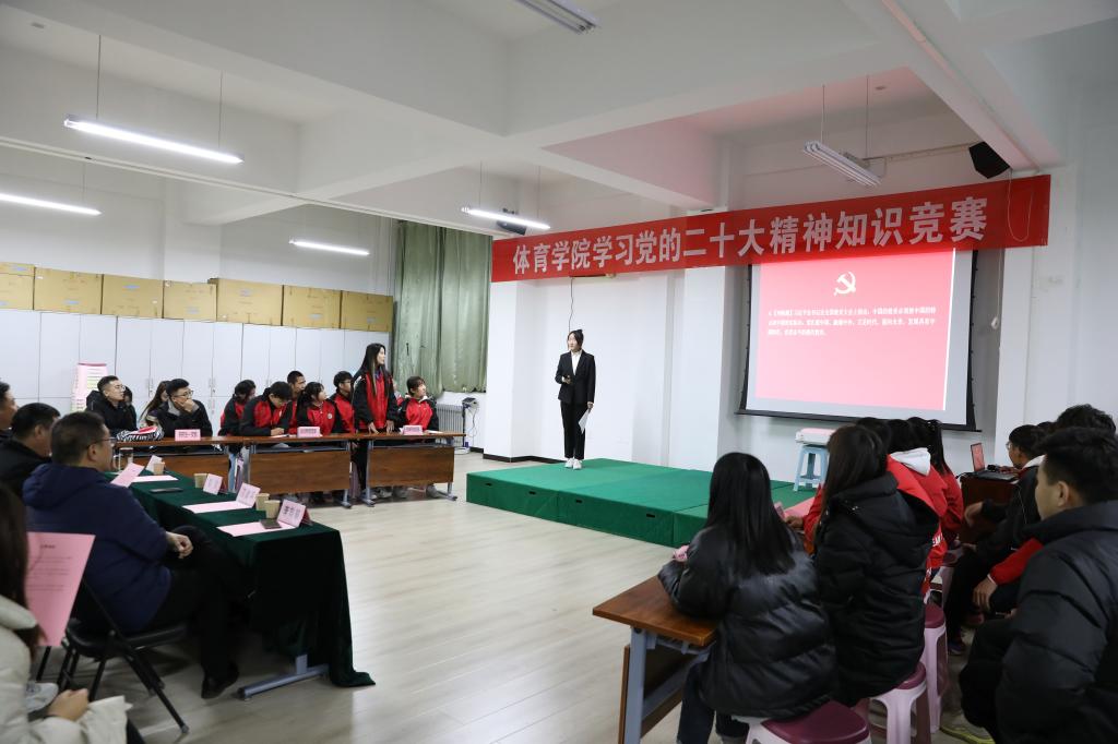 12月1日晚,304永利集团“学习党的二十大精神”知识竞赛活动决赛在运动心理实验室举行。公司党委书记卫建平,经理郑旗,副经理李向前、孟春雷,体育教育系党支部书记张杰、社会体育系党支部书记李俊明、武术与民族传统体育系党支部书记权黎明、运动训练系党支部副书记卫玲玲、研究生第一党支部书记王丽娜等现场观看比赛。