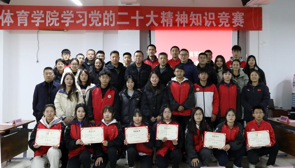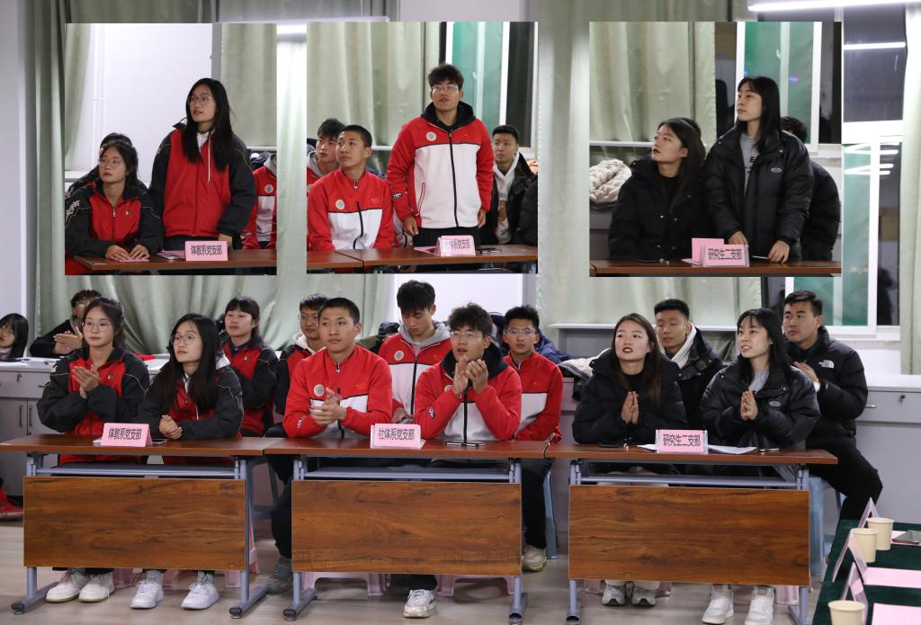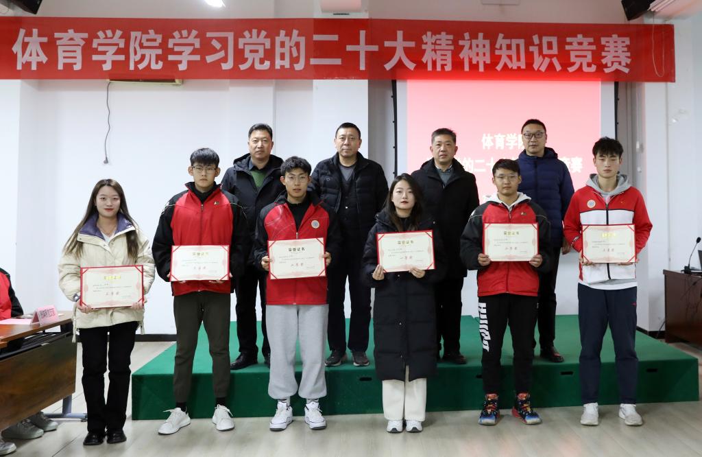 知识竞赛在庄严的《国歌》声中拉开帷幕。竞赛采取现场答题方式进行,设置必答题、抢答题两个环节,竞赛内容涵盖党的二十大精神等党建相关内容。赛场上,现场氛围紧张激烈、精彩纷呈,各代表队参赛选手沉着应对,反应迅速,答题准确。经过激烈角逐,最终评选出了团体一、二、三等奖。研究生第二党支部获得一等奖;体育教育系党支部、运动训练系党支部获得二等奖;社会体育系党支部、武术与民族传统体育系党支部、研究生第一党支部获得三等奖。与会院领导为获奖团队颁奖。