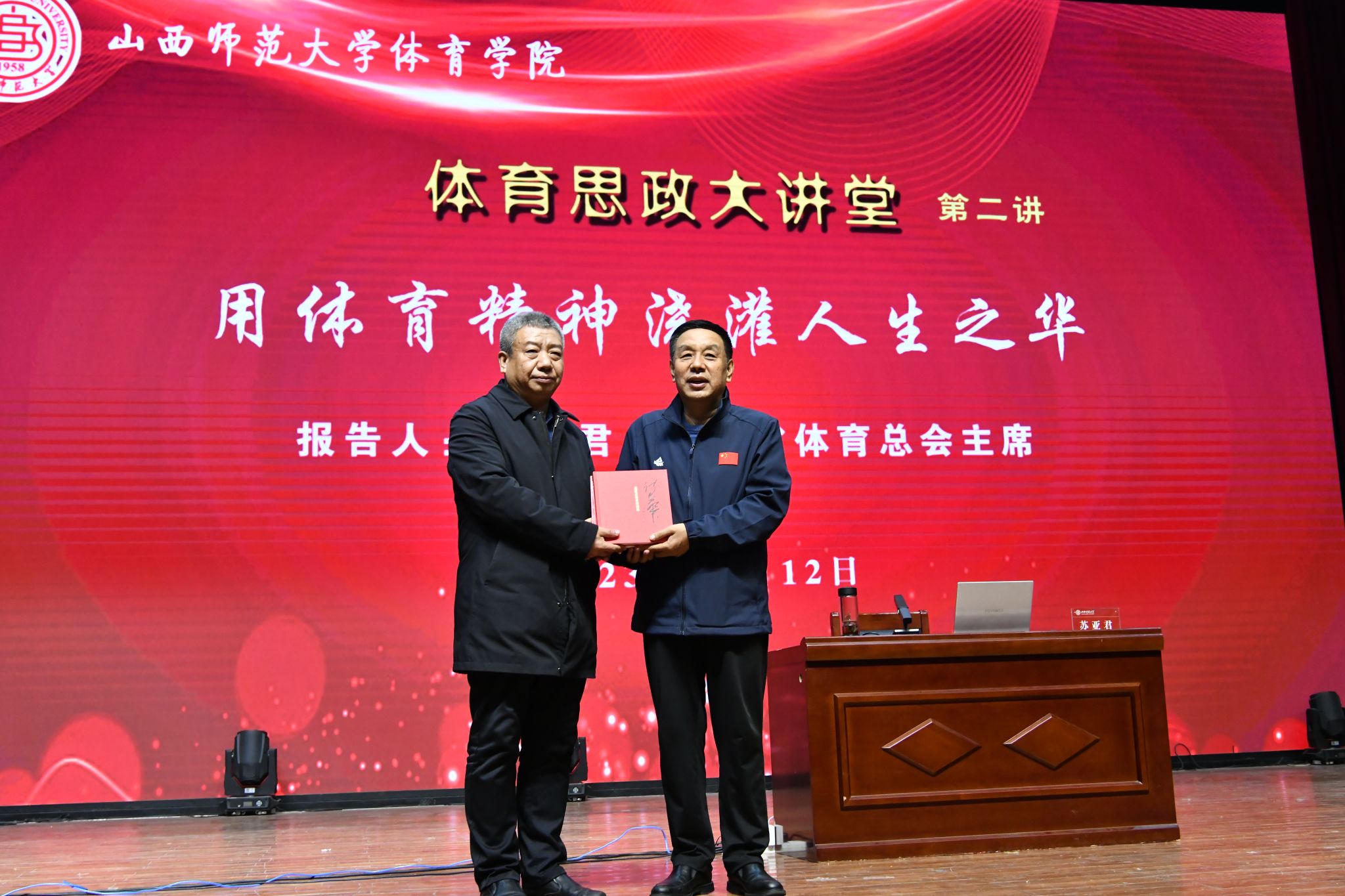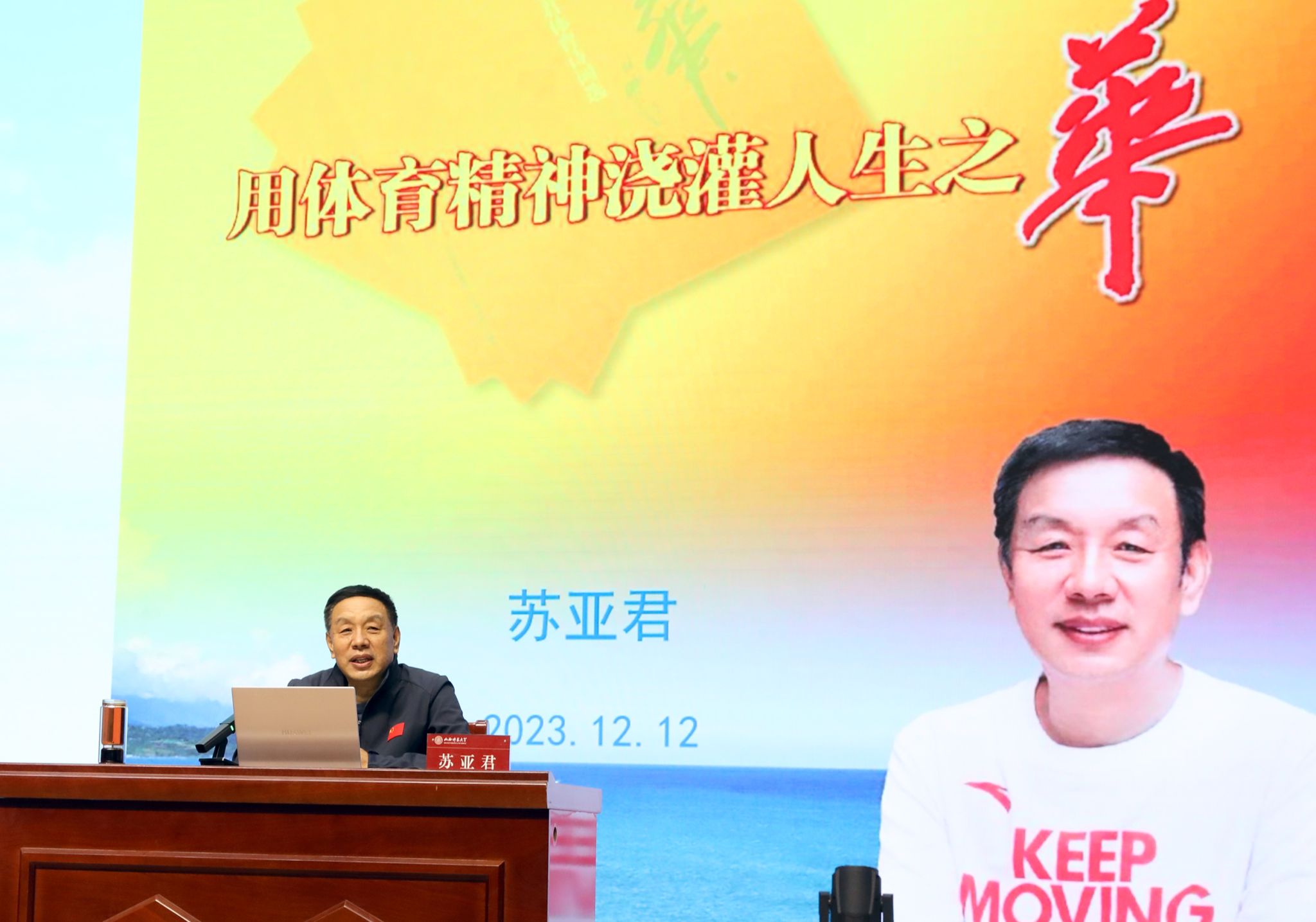 讲座中,苏亚君主席以《诗华》中一首首即兴赋吟、挥洒自如的诗作为主线,娓娓道来山西体育波澜壮阔、荡气回肠的历史故事,他以诗词的形式还原了山西省近年来体育奋斗路上的座座丰碑,一首首饱含深情的体育诗词,通俗易懂,朗朗上口,极富感染力,记载着曾经的难忘岁月、记录下山西体育事业的历史辉煌。《诗华》记载了苏主席12载体育人生的所见、所思、所感、所悟和体育情缘,既是山西体育长卷中最为瑰丽的一页,也是山西体育宝贵的精神财富。此外,苏亚君主席还带领公司师生一同欣赏了他所创作的歌曲。