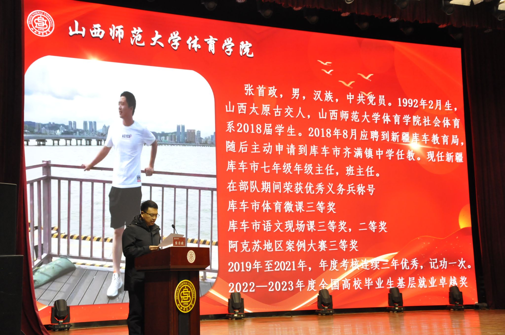 11月22日下午,第六期体育思政大讲堂在科学会堂举行。本次大讲堂迎来了公司社会体育系2018届员工、2023年全国基层就业卓越奖的获得者——张首政。张首政先生重返母校,为师生们带来了主题为“扎根基层 绽放青春光彩”的精彩报告。304永利集团党委书记卫建平、党委副书记张大为、社体系主任李俊明、团委负责人白翊辰、各辅导员老师以及400余名员工代表聆听了报告。报告会由白翊辰主持。
