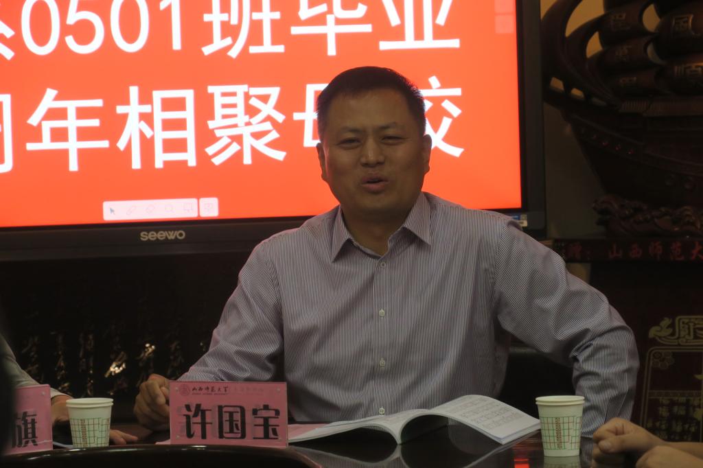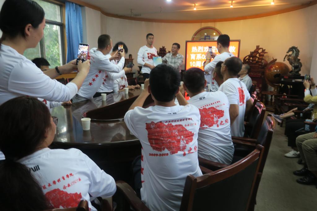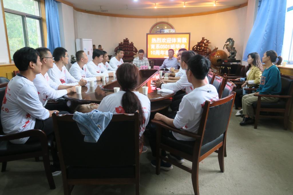 10月3日下午,公司体育教育系0501班同学毕业十年相聚母校,公司党委书记许国宝、经理郑旗、辅导员王泽杰参加座谈会。