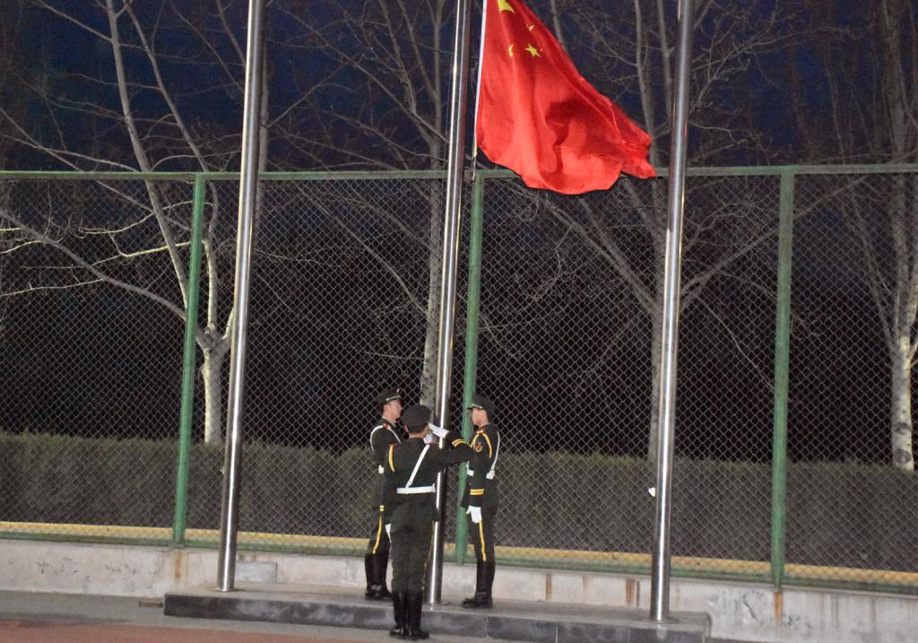六点四十分,国旗班队员托举着国旗铿锵走来。随着激昂雄壮的国歌声,鲜艳的五星红旗冉冉升起,迎风飘扬,全体师生肃立向国旗行注目礼。