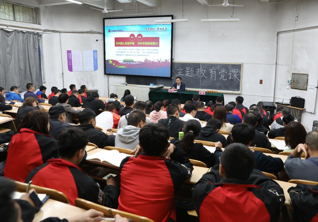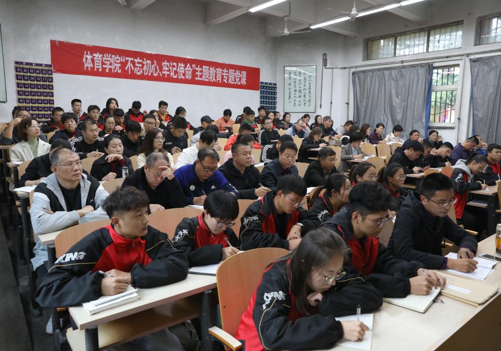 许国宝首先从党的“初心”和“使命”为切入点,带领大家回顾了中国共产党的诞生、初心的形成、各时期共产党人对初心使命的坚守、践行历程以及在各领域取得的历史性成就。他根据“守初心、担使命,找差距、抓落实”的总体目标,通过丰富的理论知识和生动的案例故事,以图文并茂的形式,分享了对本次主题教育的深刻认识和学习感悟。他指出,通过主题教育,大家要善于“学用结合”,将教学研究成果运用到教学训练中,扎实推进“三基建设”,把骨干教师培养成党员,把党员教师培养成教学、科研、管理骨干,着力落实立德树人根本任务。他强调,要把师德师风作为评价教师队伍素质的第一标准,要以德立身、以德立学、以德施教,加强老员工文明养成教育、新生辅导员培训力度、宿舍文化建设。