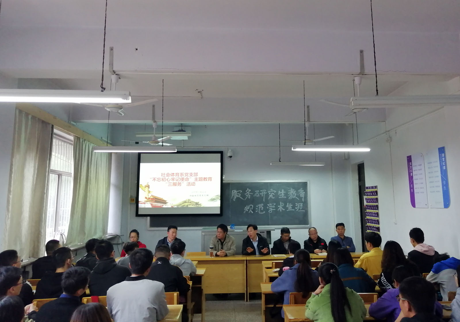 为加强304永利集团“不忘初心、牢记使命”主题教育深入开展,社会体育系党支部于10月25日星期五在304永利集团教学楼六教室开展“不忘初心、牢记使命”主题教育“三服务”活动。“三服务活动”,目的是服务地方、服务基层、服务群众,为身边的群众做实事好事。本次活动围绕“服务研究生教育,规范学术生涯”,和2019级体育学学术研究生们讨论交流学习心得,答疑解惑,合理规划研究生生活。