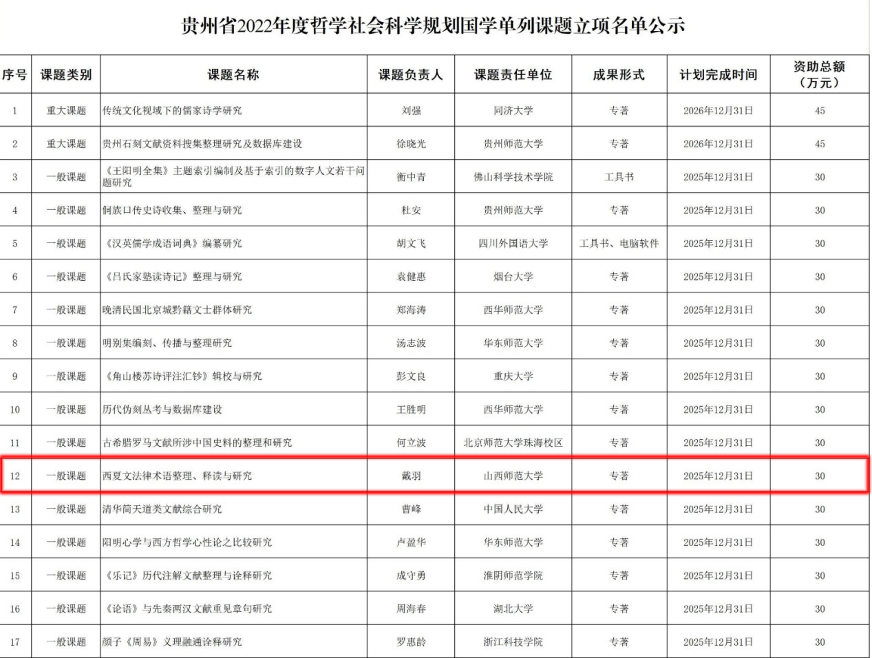 12月15日,贵州省哲学社会科学规划办公室发布贵州省2022年度哲学社会科学规划国学单列课题立项名单,公司教师戴羽副教授申报的“西夏文法律术语整理、释读与研究”获批立项一般项目。