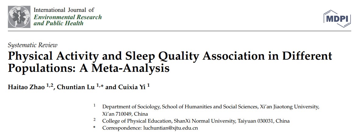 1月20日,公司教师在读博士赵海涛副教授在《International Journal of Environmental Research and Public Health》学术期刊上发表的论文“Physical Activity and Sleep Quality Association in Different Populations: A Meta-Analysis”(期刊影响因子4.614),被JCR分区SSCI(Q1)收录。该论文运用Meta分析研究方法发现不同人群身体活动与睡眠质量之间的关系;身体活动对睡眠质量的整体效应无明显的统计学意义,中低强度的身体活动对睡眠质量影响显著,而高强度的身体活动对睡眠质量的影响不显著。儿童与中老年通过身体活动可以改善睡眠质量。在身体活动干预实施过程中,通常可以采用太极拳、瑜伽、八段锦等干预内容。(院研究生部供稿)